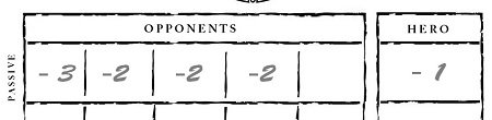 The area at the top of the sheet is to record the negative modifier of passive damage. In this example, all opponents are taking damage from thorns and barbs (-2 a round), whilst the first opponent has been wounded and is also taking damage from bleed (-3 a round). The hero is also taking -1 a round from a special ability. By having this at the top of the sheet, it should make it much easier (I hope) to see at a glance who is affected by what passive.