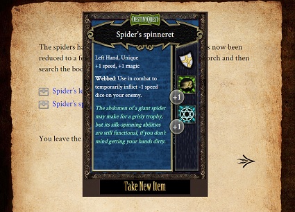 Secondly, you may have glimpsed them briefly in the trailer, one of the cool new features in DQ Infinite are the item cards. Each of the 613 items in the game has its own card, which features the details of the item (statistics and special abilities) as well as flavour text written by my good self. There is a wealth of info to uncover, not only about the items themselves but also other aspects of the DestinyQuest game world. My spy also informs me that a gallery option is likely to be added at a later date so that players can view all their ill-gotten gains.